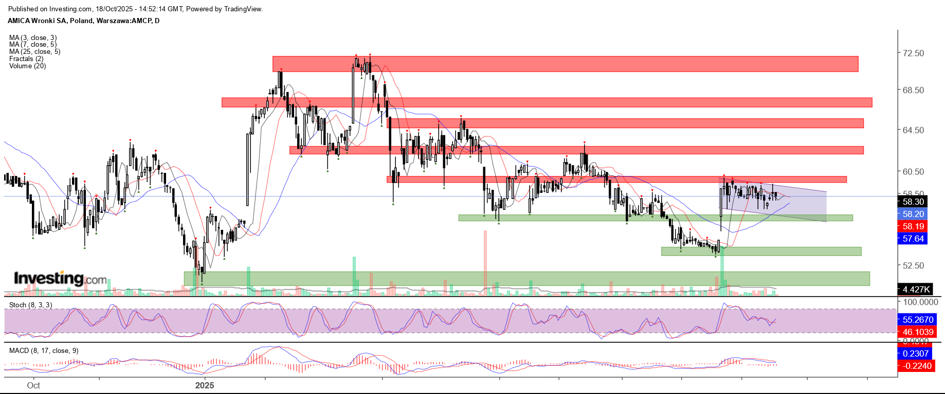 Na interwale dziennym widzimy, że 22 września doszło do bardzo mocnego odbicia, któremu towarzyszyła luka hossy i bardzo wysoki wolumen. Jest to sygnał dużej siły i popytu daje on szansę na odwrócenie trendu spadkowego, który trwał od marca. Po tym odbiciu kurs zatrzymał się na oporze w okolicach 60 zł i od tego czasu trwa lekka, która przypomina flagę. Jeśli dojdzie do wybicia górą, to wzrosty mogą być kontynuowane. Następne strefy oporów będą w okolicach 62-63 zł, 64-65,5 zł oraz kolejnych strefach zaznaczonych kolorem czerwonym.