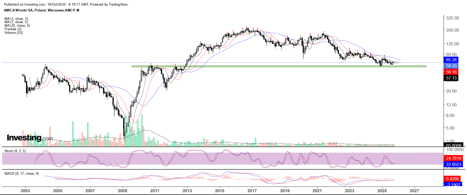 Na interwale miesięcznym widzimy, że kurs jest po mocnych spadkach, jakie trwały od roku 2021, ale w grudniu zatrzymały się one na kluczowym wsparciu w okolicach 50 zł, a aktualnie pojawia się szansa na utworzenie wyższego dołka wobec dołka z grudnia.