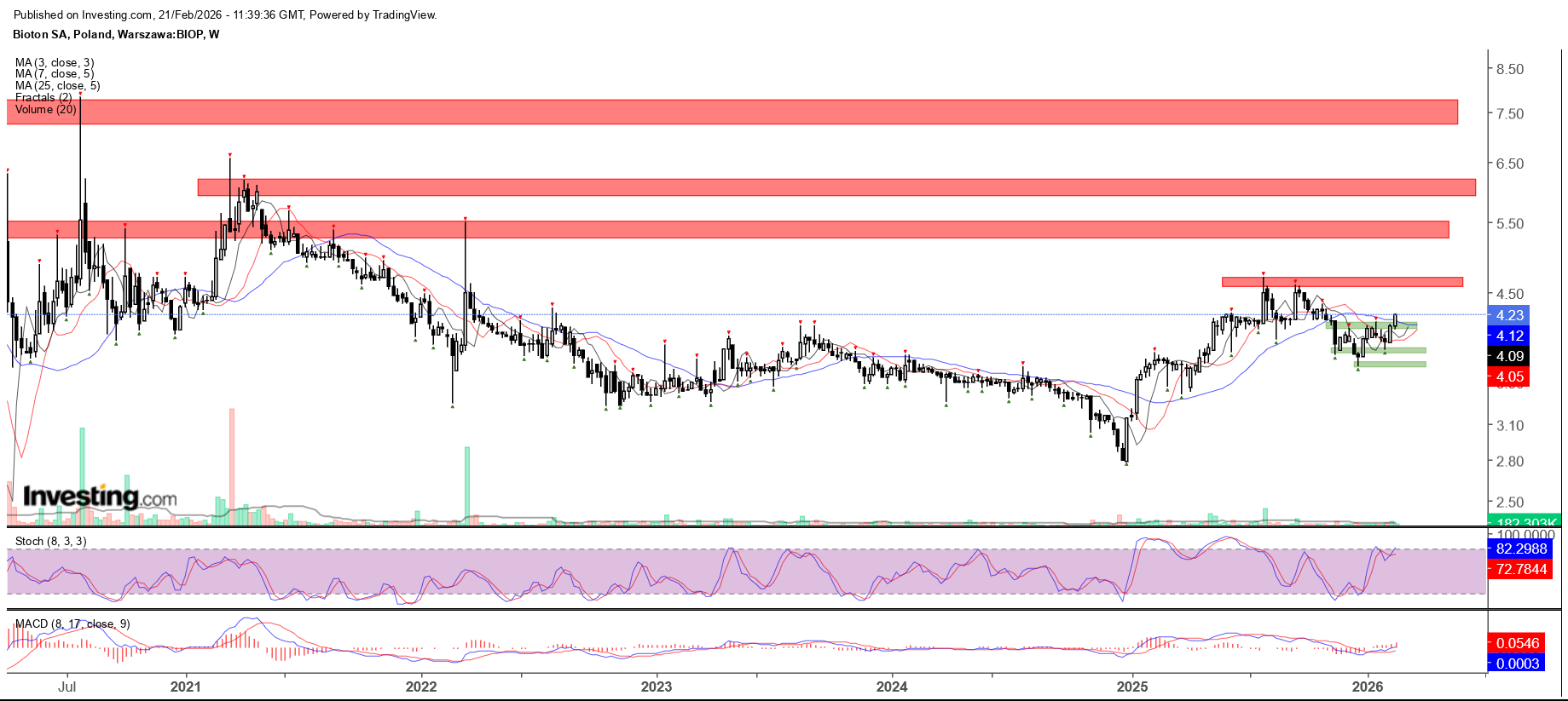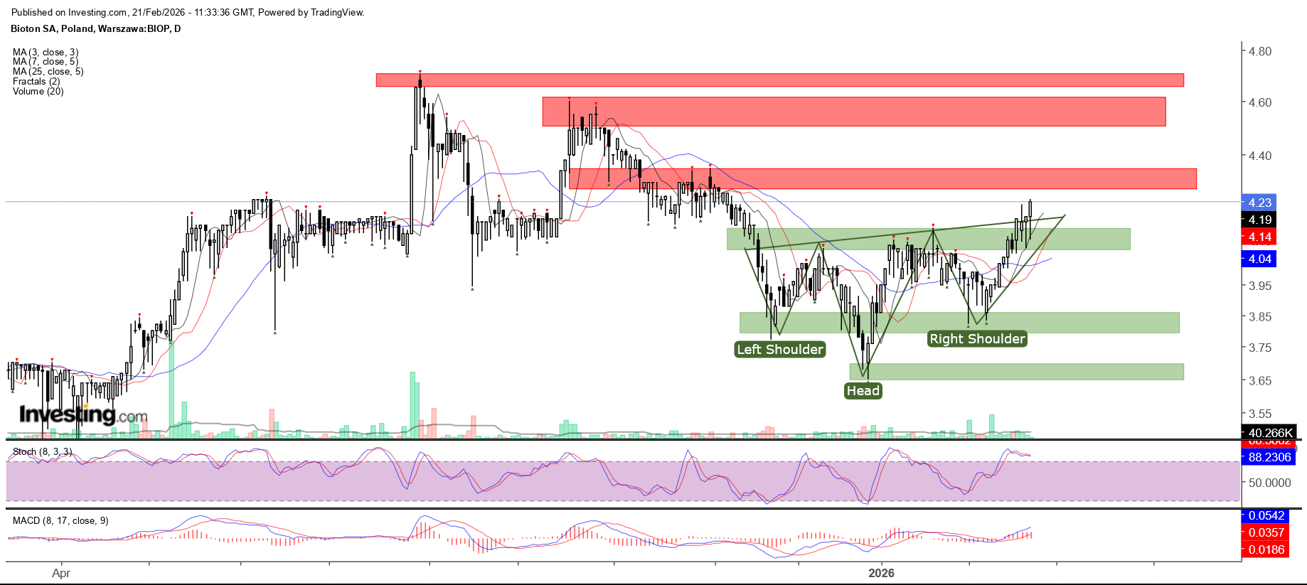 Kurs Biotonu od września poruszał się w trendzie spadkowym. Niedawno jednak doszło do wybicia górą z oRGR, co daje szansę zmiany trendu na wzrostowy. Wybita strefa szyi jest teraz najbliższym wsparciem. Kolejne kluczowe strefy wsparć są na poziomie ramion oraz na poziomie głowy. Strefy oporów zaznaczone są na czerwono. Kluczowa strefa znajduje się w okolicach 4,60-4,70 zł.