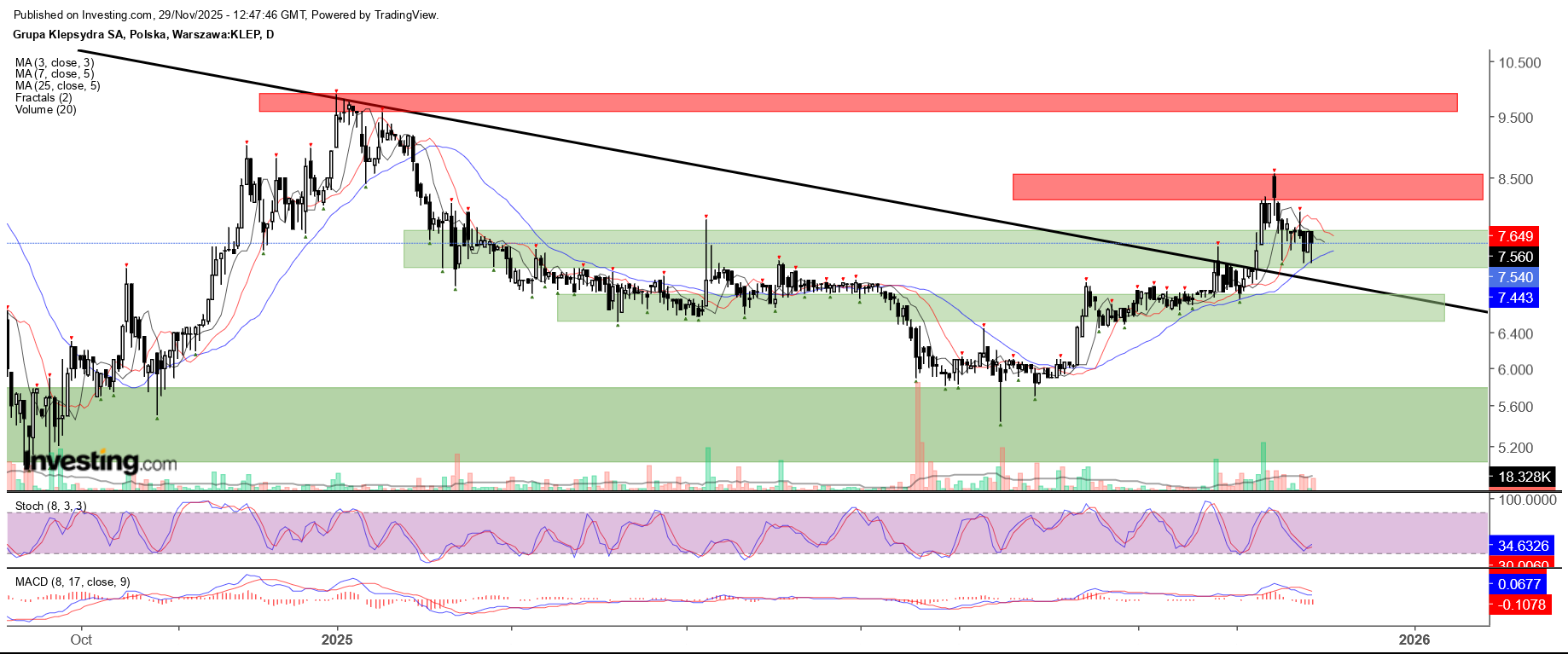 Na interwale dziennym widzimy, że wybicie było na wysokim wolumenie, a następnie przyszła korekta na niższych wolumenach. Strefa wsparcia jest broniona od kilku sesji. Jeśli dojdzie teraz do odbicia, to oporem będzie szczyt z 17 listopada, a następnie szczyt z początku 2025 roku. Jeśli aktualne wsparcie zostanie przebite, to jako wsparcie może również działać przebita linia trendu, a kolejna pozioma strefa wsparcia będzie w okolicach 6,50-6,90 zł.