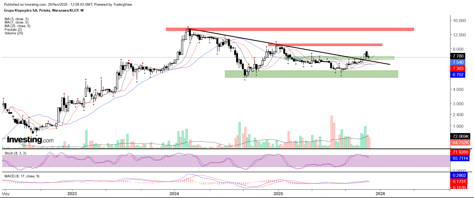 Na interwale tygodniowym widzimy, że kurs od lutego 2024 roku poruszał się w trendzie spadkowym. Latem tego roku utworzony został wyższy dołek wobec dołka z roku 2024, a niedawno przebita została spadkowa linia trendu oraz ważna strefa w okolicach 7,30-7,80 zł. Aktualnie strefa ta testowana jest jako wsparcie. Jeśli uda rozwinąć się trend wzrostowy, to kluczowe opory będą w okolicach 9,5-10 zł oraz w okolicach 13-13,70 zł.