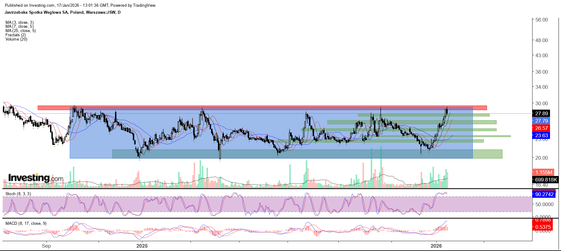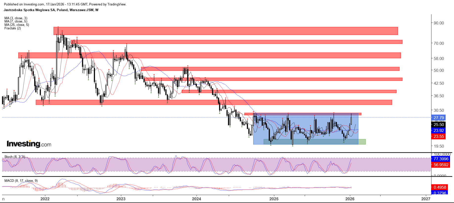Kurs JSW od 2024 roku porusza się w trendzie bocznym. Aktualnie znajduje na górnym ograniczeniu konsolidacji, które jest poważnym oporem. Piątkowa sesja zakończyła się czarną spadkową świecą. Kurs może być wykupiony po mocnych wzrostach trwających od 18 grudnia. Sytuacja sprzyja więc korekcie spadkowej. Potencjalne wsparcia zostały zaznaczone kolorem zielonym. Kluczowe wsparcie znajduje się dopiero na dolnym ograniczeniu konsolidacji.
