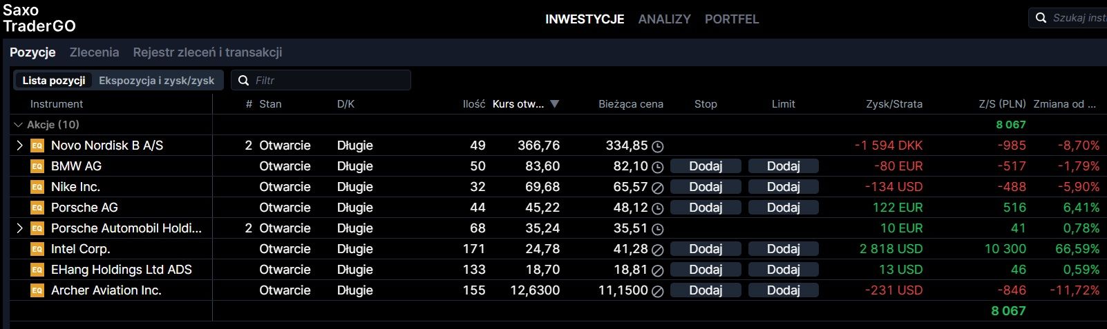 Zgodnie z przyjętą strategią inwestowania w spółki z sektorów na które nie mam możliwości mieć ekspozycji na polskiej giełdzie, w portfelu mam zatem producentów samochodów (Porsche, BMW), półprzewodników i komputerów (Intel), tzw. big pharmę (Novo Nordisk), producentów elektrycznych pojazdów latających, pionowego startu i lądowania (EHang i Archer) oraz globalną markę odzieży sportowej (Nike).