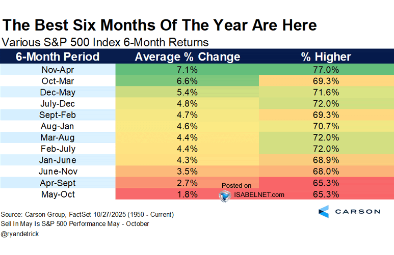 Od poniedziałku zaczynamy statystycznie najlepszy 6-miesięczny okres dla giełdy akcji! 😃Od listopada do końca kwietnia średni wzrost indeksu S&P500 🇺🇸 od 1950 roku wynosi +7,1% wobec zaledwie 1,8% od maja do października! 😲Różnica to zatem aż 5,3 pp a wynik jest aż o 194% lepszy niż gdyby ktoś zaczął w maju i wyszedł pod koniec października!📈 Mało tego, prawdopodobieństwo że za 6 miesięcy indeks S&P500 będzie wyżej to aż 77%, bazując na statystyce historycznej, począwszy od 1950 roku. W USA nazywa się to efektem Halloween 🎃a w Polsce mówi się "KUPUJ NA TRUPOSZA🕯️ SPRZEDAJ NA BABOSZA 💃"