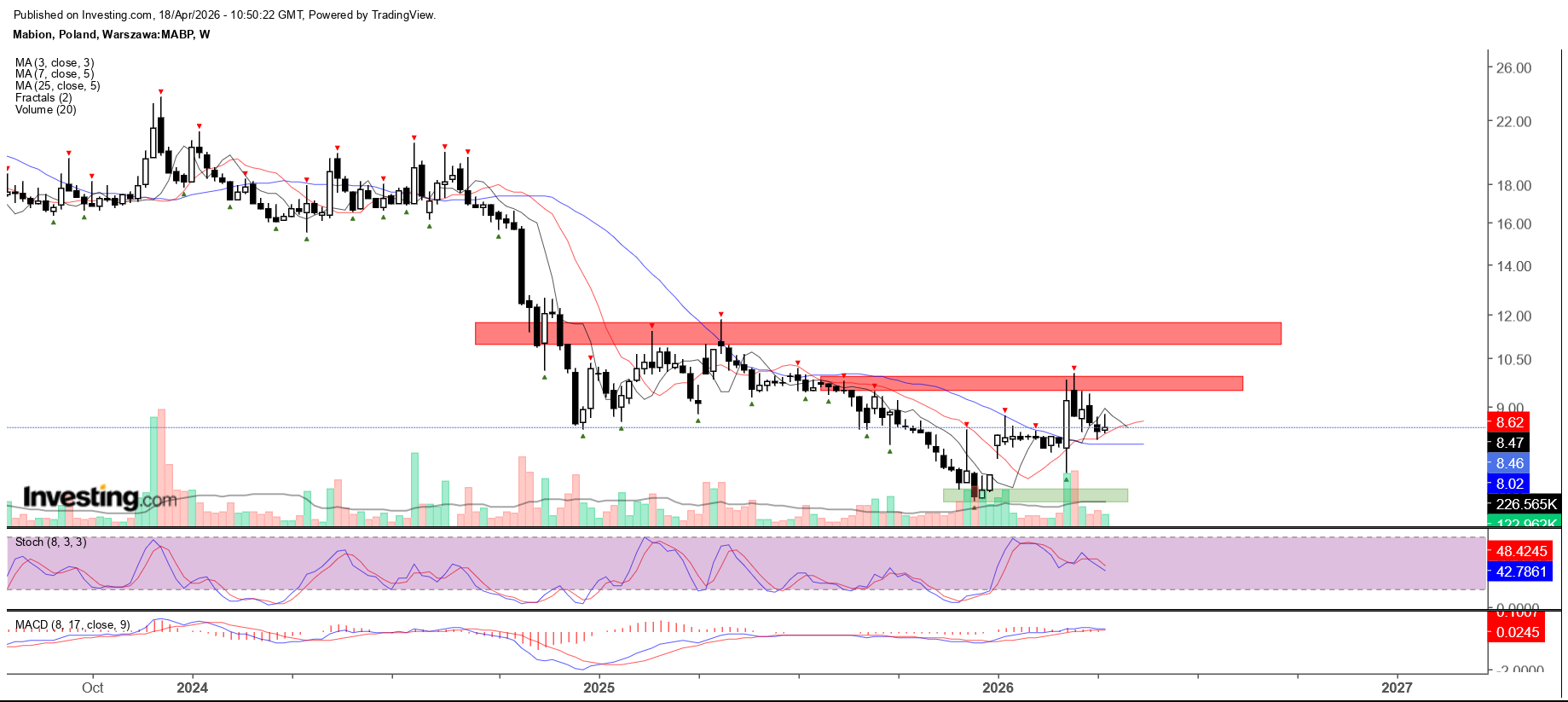 Na interwale tygodniowym mamy zaznaczone na czerwono najbliższe kluczowe opory. Pierwszy z nich znajduje się na szczycie 9,50-10 zł a druga strefa w okolicach 11-11,75 zł.