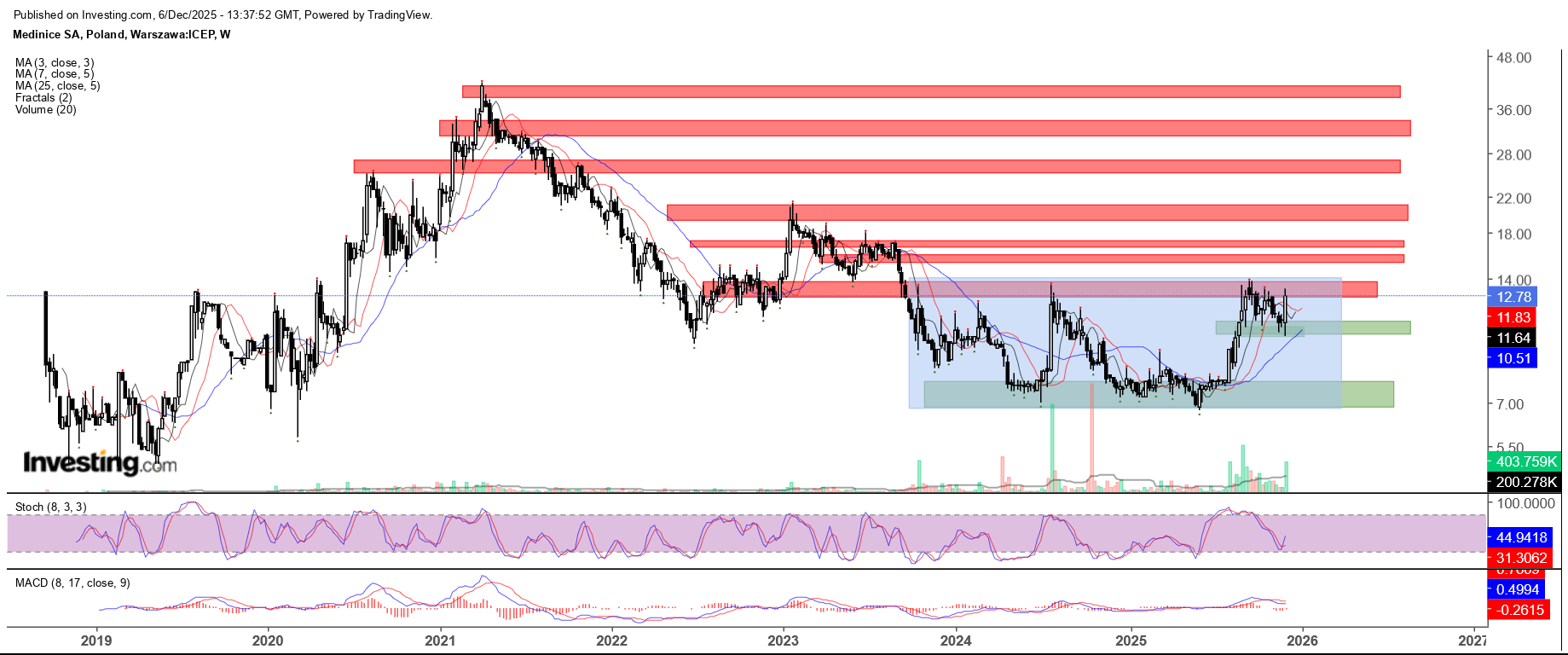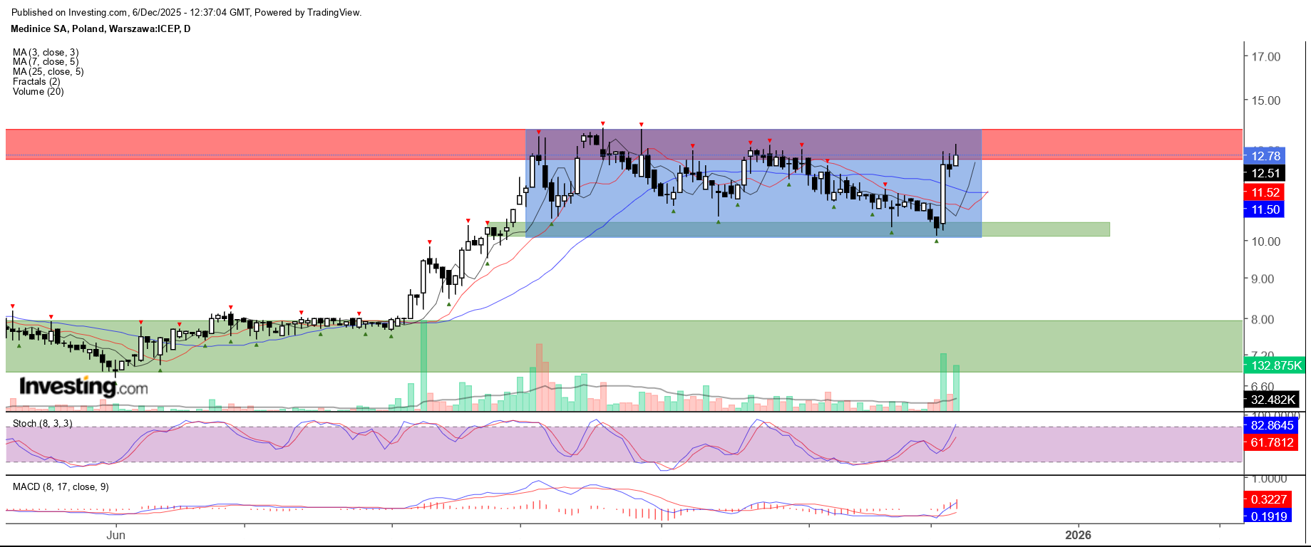Kurs Medinice od września porusza się w konsolidacji. Ostatnie sesje przyniosły mocne wzrosty na wysokich wolumenach. Świadczy to o wysokim popycie i daje szansę na wybicie górą. Aktualnie kurs znajduje się na oporze, więc na razie lepiej nie wchodzić, ale z pewnością warto go obserwować. Jeśli dojdzie do cofnięcia, to kluczowym wsparciem będzie dolne ograniczenie konsolidacji w okolicach 10,15-10,80 zł.