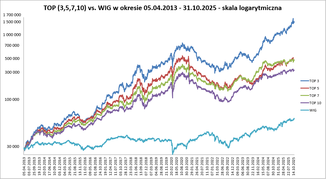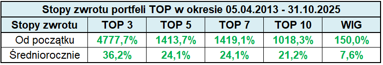 Wyniki prowadzonych przez nas modelowych portfeli TOP 3, TOP5, TOP 7 i TOP 10 na koniec października, w porównaniu z indeksem WIG - wystartowaliśmy w kwietniu 2013 roku 👇
