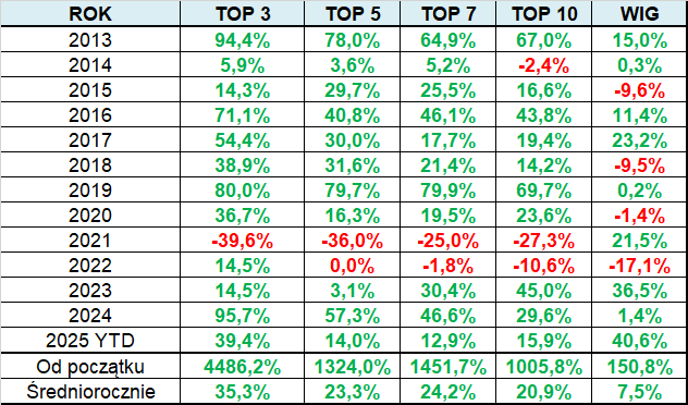 Historycznie, licząc od początku prowadzenia portfeli, TOP3 zarabiał średniorocznie 35,3%, TOP5 zarabiał 23,3%, TOP7 zarabiał 24,2% a TOP10 zyskiwał 20,9%.