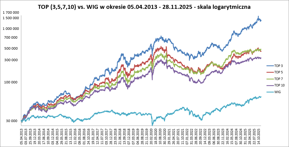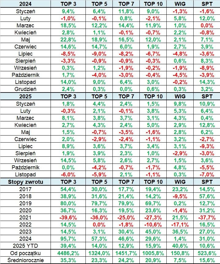 W oparciu o rankingi "TOP 15 Poland" tworzymy modelowe portfele, na takiej zasadzie, że do TOP3 wchodzą spółki z miejsc 1-3, do portfela TOP5 spółki z miejsc 1-5, do TOP7 spółki z miejsc 1-7 i w końcu do TOP10 wchodzi po prostu zawsze pierwsza dziesiątka. Przykładowo - najnowszy raport ukazał się 15.12, zatem do portfela TOP3 wstawiamy spółki z podium rankingu i od 16.12.2025 liczymy ich wyniki i całego portfela.