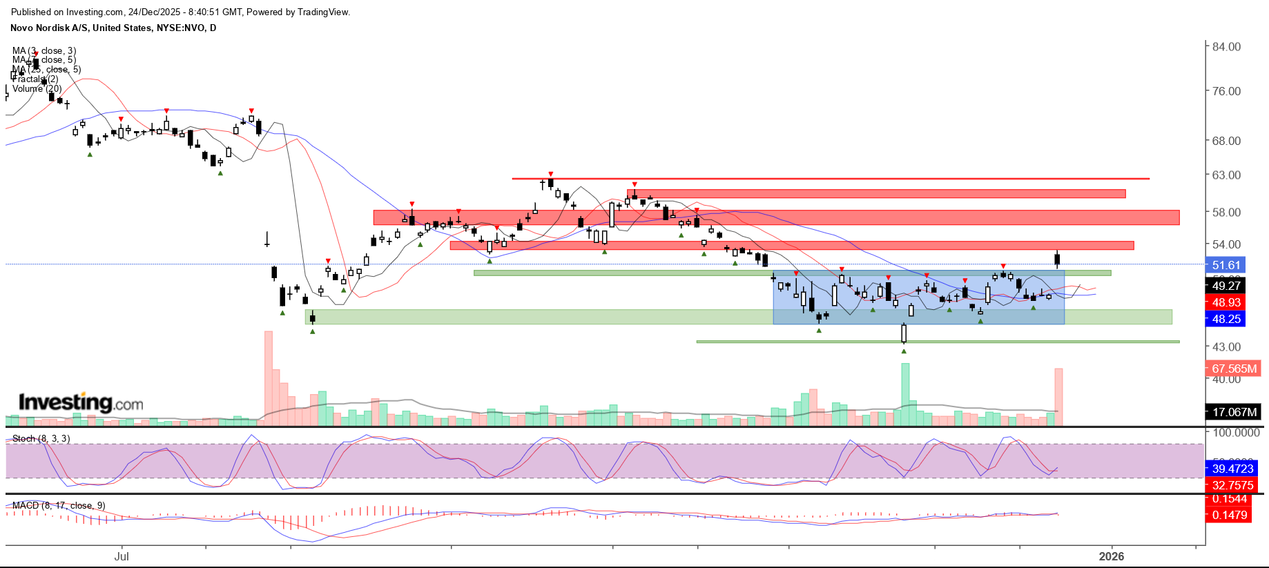 Kurs Novo Nordisk jest po mocnych spadkach, które trwały od połowy 2024 roku. W sierpniu tego roku spadki wyhamowały i doszło do odbicia. Odbicie trwało do września i następnie kurs znów powrócił do spadków. Ważne jednak jest to, że dołek z sierpnia został obroniony, a próba jego przebicia, jaką widzimy na świecy z 24 listopada, okazała się fałszywa. Od końca października do wczorajszej sesji trwała akumulacyjna konsolidacja zaznaczona w niebieskim prostokącie. Fałszywe wybicie dołem z 24 listopada zadziało jak „sprężyna” i doprowadziło do wybicia górą podczas wczorajszej sesji. Luka hossy oraz bardzo wysoki wolumen świadczą o bardzo wysokim popycie. Trwający od wrześniowego szczytu trend wzrostowy został odwrócony.