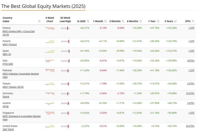 🔥Polska giełda za ostatnie 3 lata z wynikiem +126,7% zajmuje 2 miejsce na świecie pod względem stopy zwrotu rozliczanego w euro! 🙌👏Ustępujemy tylko Grecji, która jak wiadomo startowała z pozycji bankruta🇬🇷 Dla porównania USA dały zarobić tylko 56,16% 🇺🇸 Dane bazujące na wyniku ETF na polskie akcje (MSCI Poland) o symbolu EPOL.