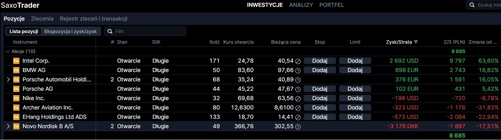 🔥Od połowy września (pierwsze zakupy 11.09) prowadzę portfel globalny 🌎 w którym inwestuję w spółki z branż, których nie ma na GPW, jak półprzewodniki, producenci samochodów🏎️ czy big pharma💊 Mam też akcje mojej ulubionej marki odzieży sportowej 👟Najbardziej szalone pozycje za niewielki kapitał to...latające taksówki (e-VTOL) na których notuje spore straty ale niech leżą😀W Ubera też absolutnie na początku nie wierzyłem a jednak dał zarobić cierpliwym inwestorom. Przez te niecałe 3 pierwsze miesiące mam łącznie 10,4% zysku, liczonego w PLN. Najwięcej na Intelu (+63,6%) ale zadowolony jestem z BMW i Porsche Automotive Holding (oba po +16%). Problematyczny pozostaje Novo Nordisk i ww. przyszłe "Ubery latające" 🙂 Wrzucam screen z mojego rachunku w Saxo z dzisiaj z godz. 9:22 jako weryfikację 😉Kliknij aby powiększyć 👇