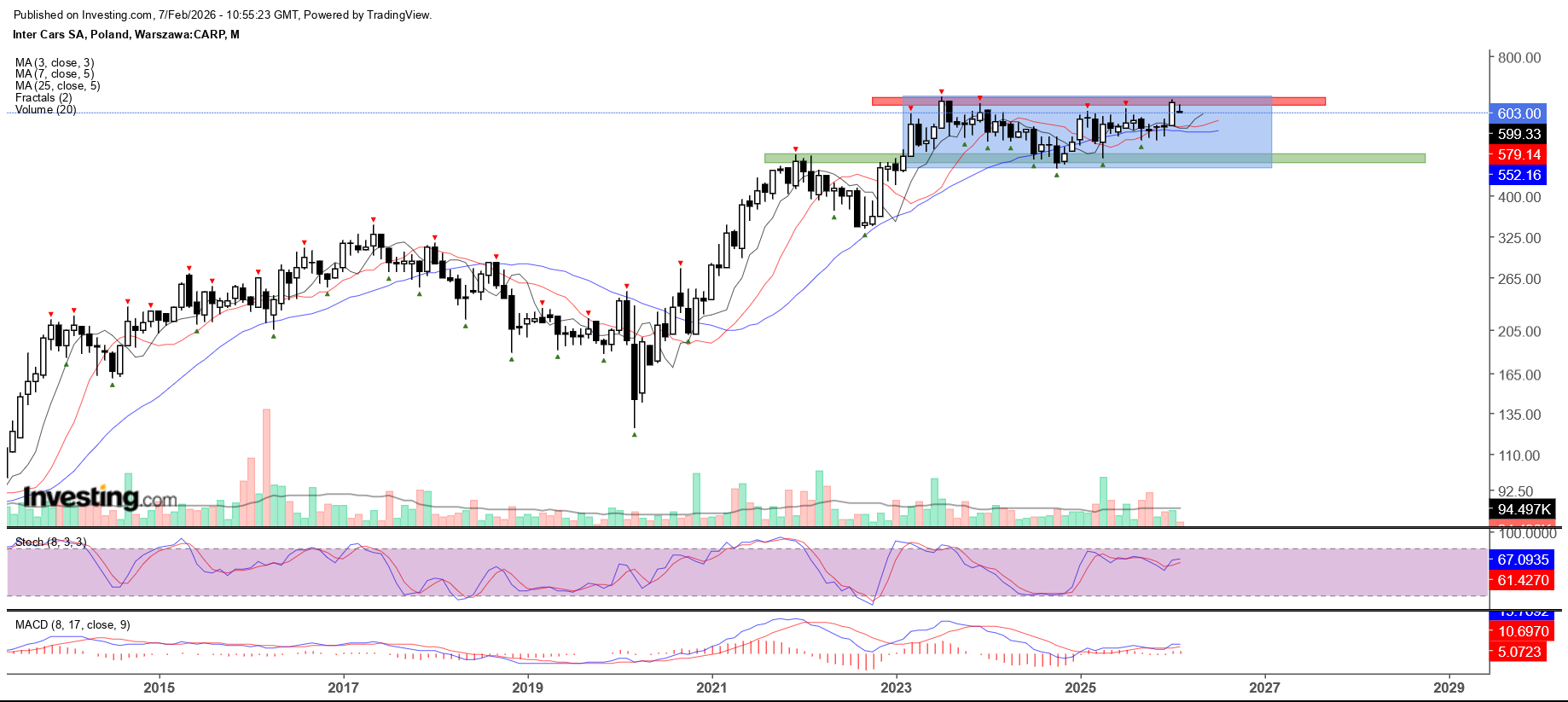 Na interwale miesięcznym widzimy, że jest tu długoterminowy trend wzrostowy, który trwa od wielu lat. Trend ten zatrzymał się jednak w roku 2023 i od tego czasu kurs jest fazie konsolidacji. Konsolidacja jest formacją kontynuacji trendu, dopóki nie dojdzie do wybicia dołem. Jeśli dojdzie do wybicia górą, to pojawi się potencjalny sygnał kupna.