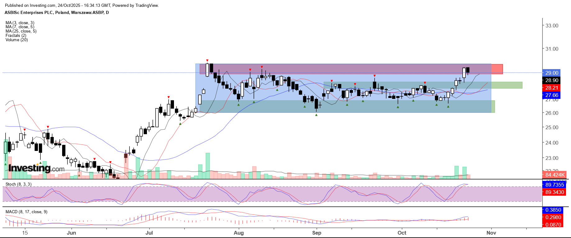Jeśli jednak najpierw dojdzie do cofnięcia, to najbliższa strefa wsparcia będzie w okolicach 27,70-28,30 zł. Kluczowa strefa wsparcia znajduje się w okolicach 26-27 zł. Przebicie tej kluczowej strefy oznaczałoby wyjście dołem z konsolidacji i byłoby sygnałem negatywnym.