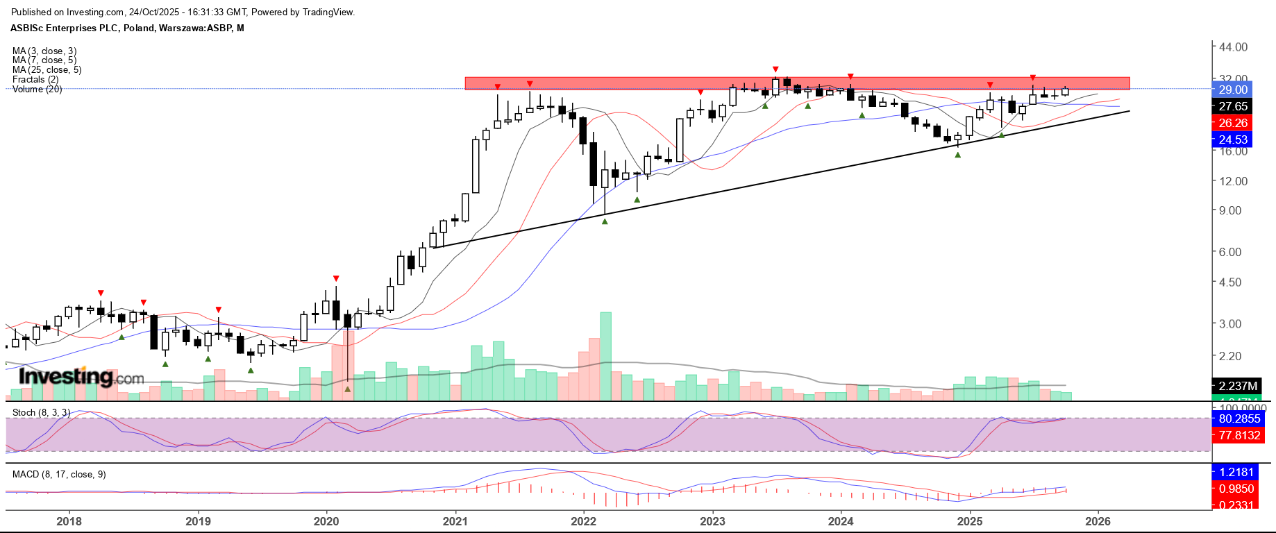 Na interwale miesięcznym można zauważyć, że rysuje się formacja przypominająca długoterminowy trójkąt zwyżkujący. Potrzebne jest jednak przebicie strefy oporu w okolicach 29-32 zł. Jeśli się to nie uda, to kurs może cofnąć się w kierunku linii trendu, a jeśli ją przebije, to projekcja trójkąta przestanie być aktualna.
